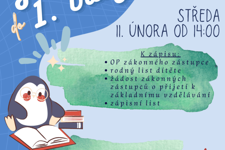 Zápis žáků do 1. ročníku - středa 11. 2. 2026 Zápis žáků do 1. třídy proběhne ve středu 11. února od 14:00 v budově základní školy. Veškeré potřebné…